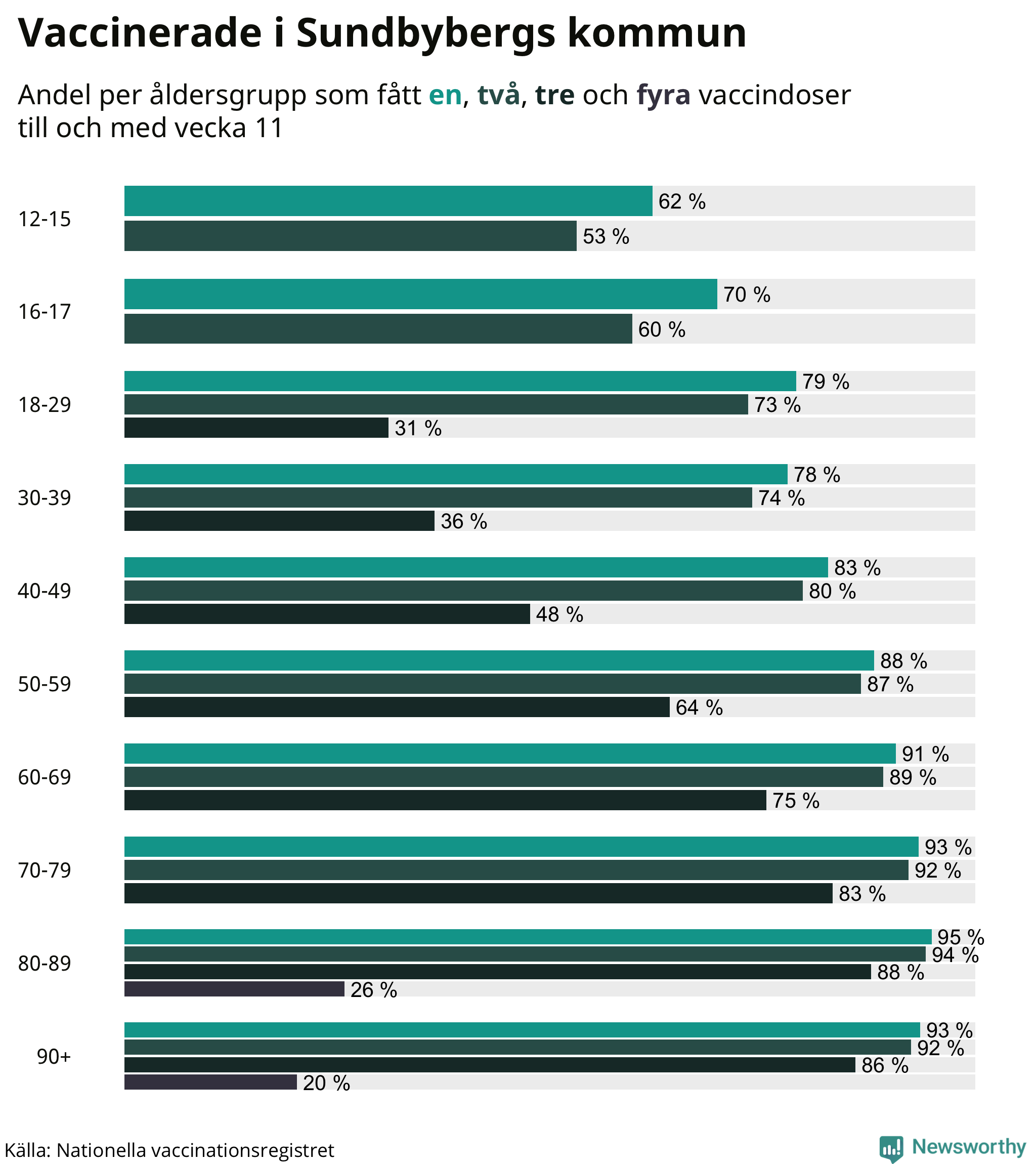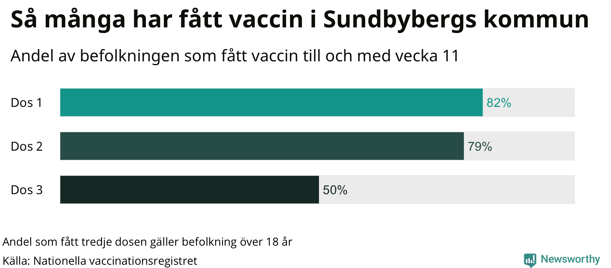 Totalt har 37 641 personer i Sundbyberg fått sin första vaccindos fram till vecka elva, enligt Nationella vaccinationsregistret. Det innebär att 82 procent av befolkningen fått minst en dos. Det är en lägre andel än i de flesta andra kommuner. Hammarö kommun har vaccinerat flest i hela landet (95 procent).