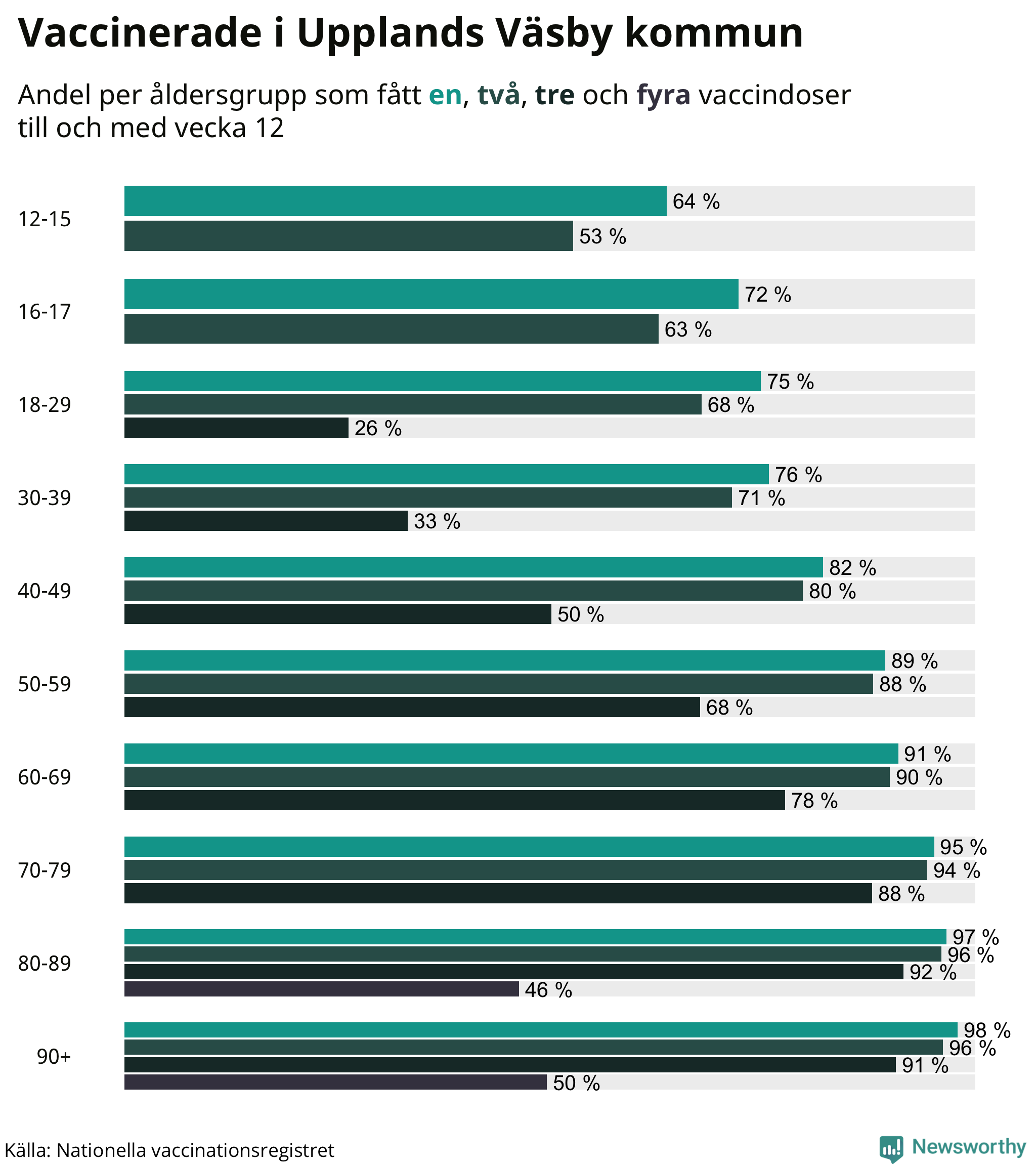 Totalt har 33 303 personer i Upplands Väsby fått sin första vaccindos fram till vecka tolv, enligt Nationella vaccinationsregistret. Det innebär att 82 procent av befolkningen fått minst en dos. Det är en lägre andel än i de flesta andra kommuner. Hammarö kommun har vaccinerat flest i hela landet (95 procent).