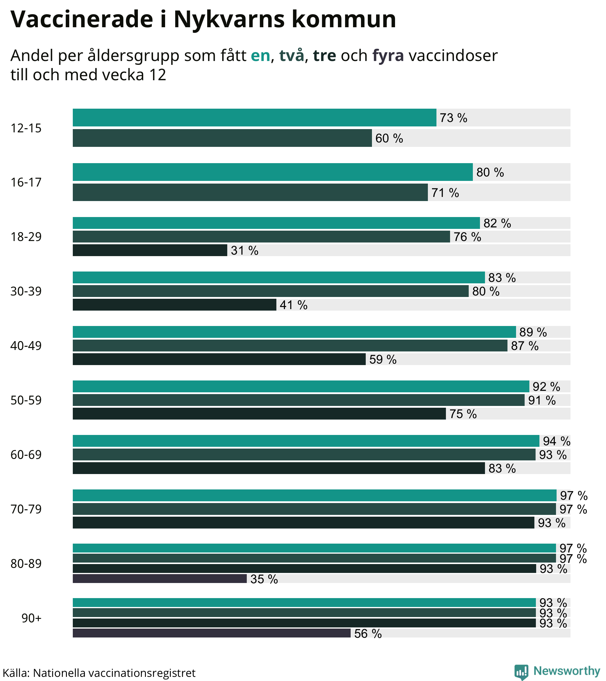 Äldre personer är betydligt mer sårbara för det nya coronaviruset än yngre. Därför har äldre prioriterats i vaccineringen. Personer över 80 år rekommenderas numera att ta en fjärde vaccinationsdos. I Nykvarn har hittills 166 personer – eller 37 procent av 80-plussarna – fått en fjärde spruta.