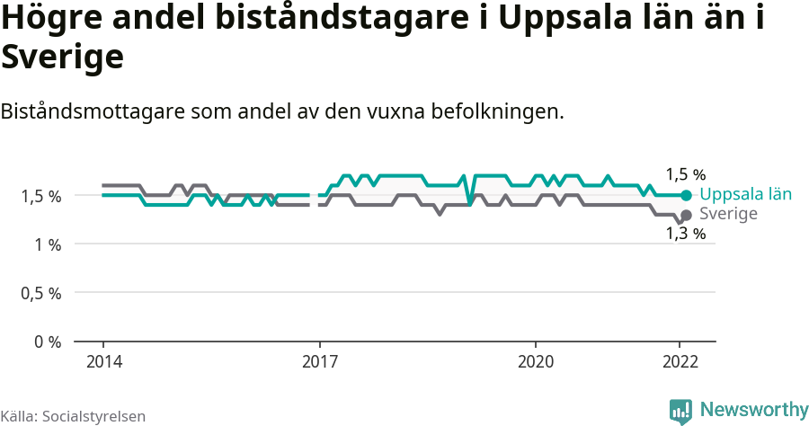 Totalt fick 5 795 personer i Uppsala län ekonomiskt bistånd stöd under februari, vilket alltså motsvarar 1,5 procent av den vuxna befolkningen. Det är ungefär lika stor andel som föregående månad. Sedan samma månad förra året innebär det en minskning med 0,1 procentenheter.