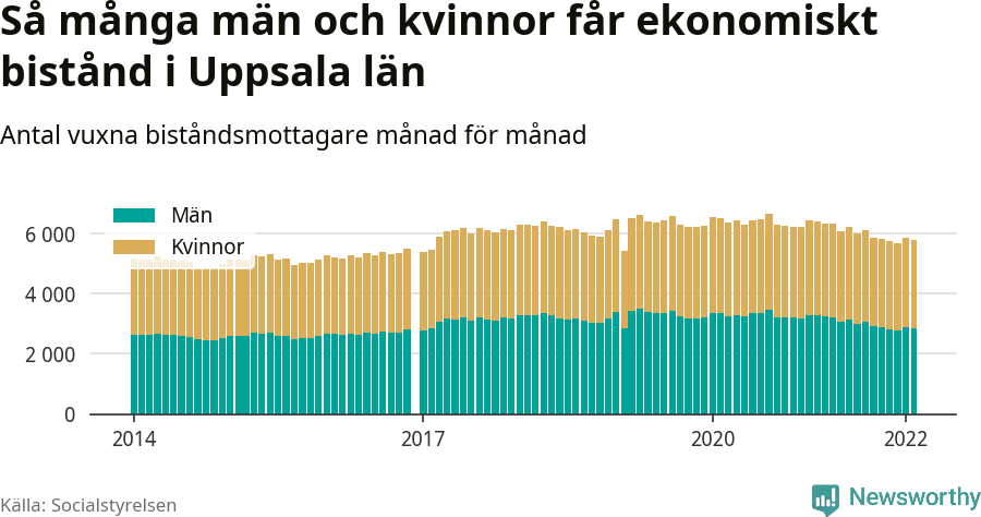 Av biståndstagarna i Uppsala län var förra månaden 2 951 kvinnor och 2 844 män.