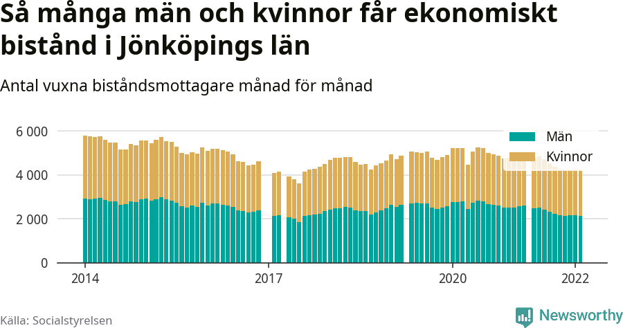 Av biståndstagarna i Jönköpings län var förra månaden 2 110 kvinnor och 2 126 män.