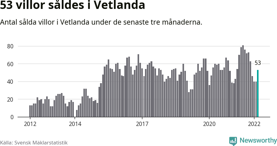 Sammanlagt såldes 53 villor i Vetlanda kommun mellan januari och mars till ett genomsnittligt pris på 1,9 miljoner kronor. I fjol gjordes 43 affärer vid den här tiden på året.