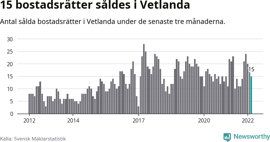 Mellan januari och mars gjordes sammanlagt 15 affärer med bostadsrätter i Vetlanda kommun. Det kan jämföras med 22 vid motsvarande tid i fjol.