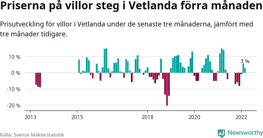 Villapriserna har gått upp i Vetlanda kommun. Medelpriset på försäljningarna under de senaste tre månaderna visar på en uppgång med 3 procent.
