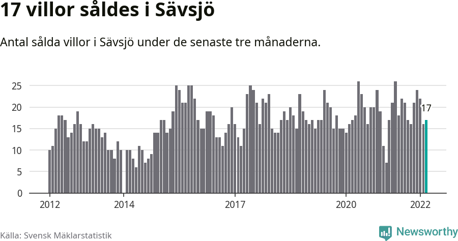 Mellan januari och mars gjordes sammanlagt 17 affärer med villor i Sävsjö kommun. Det är lika många affärer som vid motsvarande tid i fjol.
