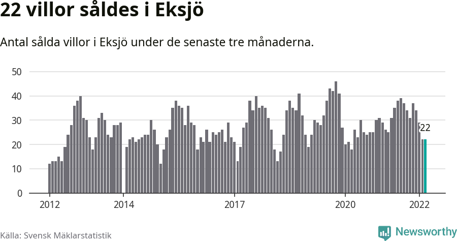 Mellan januari och mars gjordes sammanlagt 22 affärer med villor i Eksjö kommun. Det kan jämföras med 25 vid motsvarande tid i fjol.