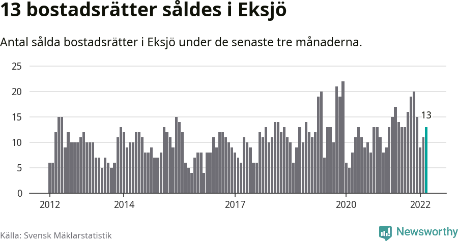 Mellan januari och mars gjordes sammanlagt 13 affärer med bostadsrätter i Eksjö kommun. Det är lika många affärer som vid motsvarande tid i fjol.
