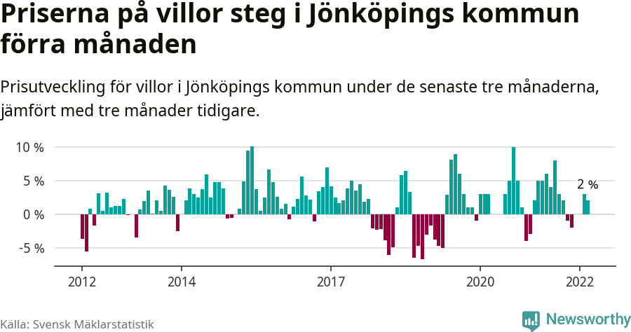 Villapriserna har gått upp i Jönköpings kommun. Medelpriset på försäljningarna under de senaste tre månaderna visar på en uppgång med 2 procent.