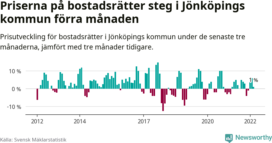 Priserna på bostadsrätter har gått upp i Jönköpings kommun. Medelpriset på försäljningarna under de senaste tre månaderna visar på en uppgång med 1 procent.