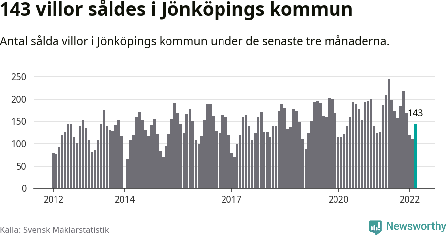 Sammanlagt såldes 143 villor i Jönköpings kommun mellan januari och mars till ett genomsnittligt pris på 4,6 miljoner kronor. I fjol gjordes 125 affärer vid den här tiden på året.