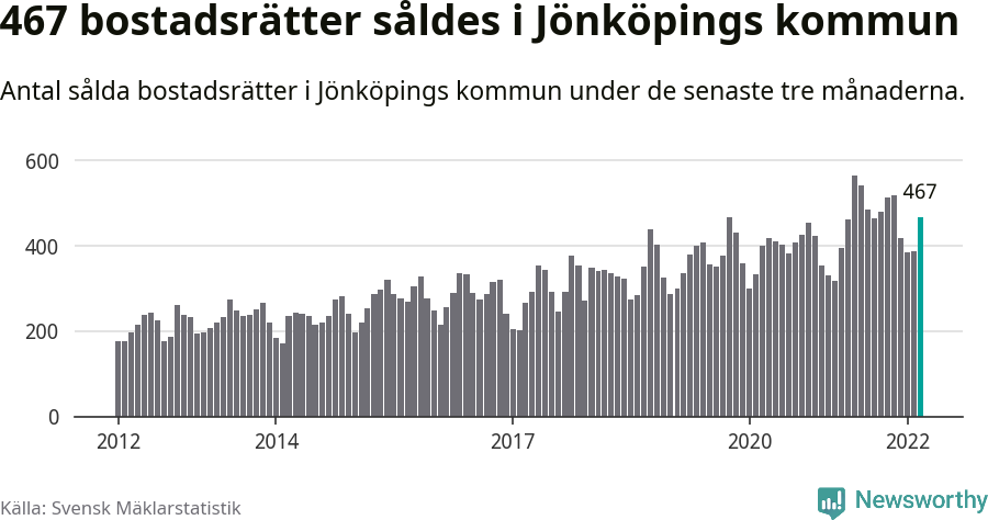 Sammanlagt såldes 467 bostadsrätter i Jönköpings kommun mellan januari och mars till ett genomsnittligt pris på 2,5 miljoner kronor. I fjol gjordes 396 affärer vid den här tiden på året.