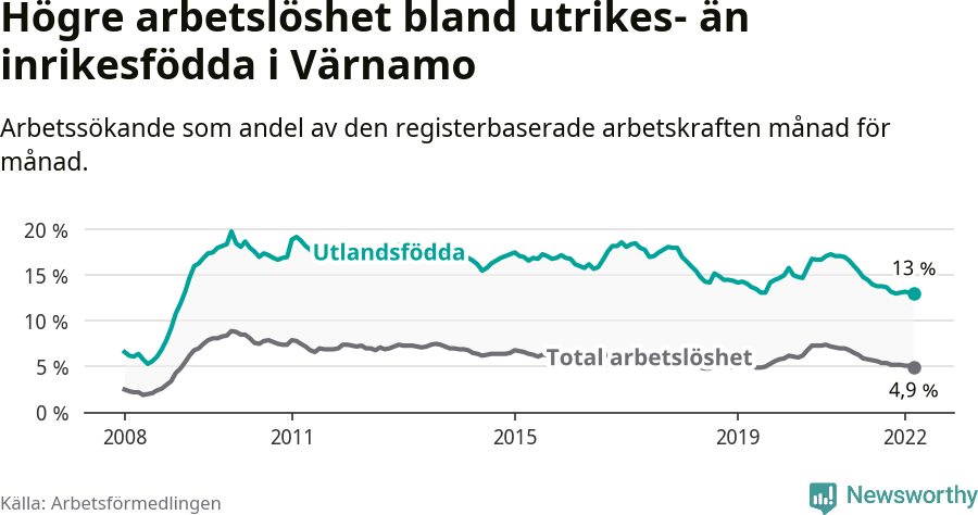 Skillnaden i arbetslöshet mellan utrikesfödda och hela befolkningen är 8,1 procentenheter i Värnamo. Det är en mindre skillnad än för ett år sedan (−1,1 procentenheter).