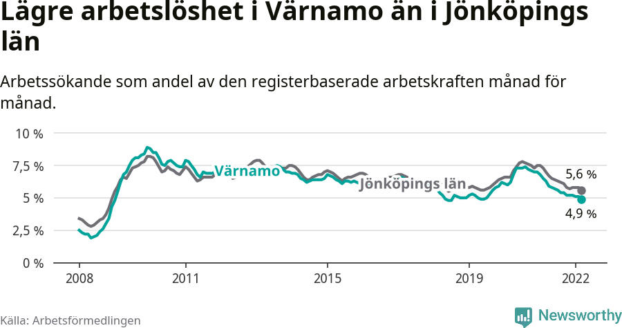 Det är tolfte månaden i följd som arbetslösheten i Värnamo är lägre än den var under samma tidpunkt året innan. Sedan mars 2021 har arbetslösheten gått ner från 6,3 till 4,9 procent. Den nuvarande arbetslöshetsnivån är därmed den lägsta sedan juni 2019.