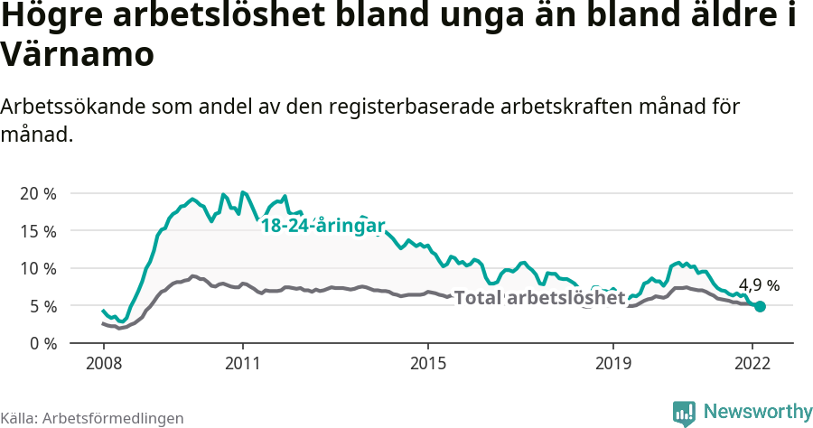 Den senaste månadsstatistiken från Arbetsförmedlingen visar på en nedgång i ungdomsarbetslöshet i Värnamo kommun med 3,0 procentenheter. Arbetslösheten bland personer i åldern 18–24 år låg i mars på 4,9 procent.