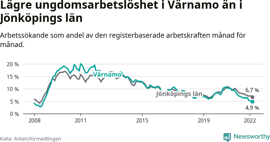 Precis som den totala arbetslösheten ligger ungdomsarbetslösheten i Värnamo lägre än i Jönköpings län som helhet. Skillnaden mellan kommunen och länet är 1,8 procentenheter.