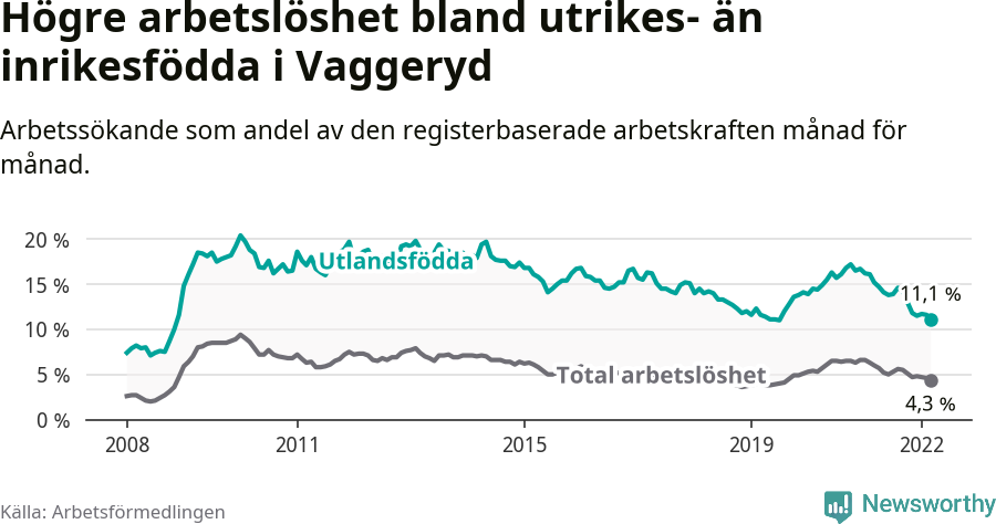 Skillnaden i arbetslöshet mellan utrikesfödda och hela befolkningen är 6,8 procentenheter i Vaggeryd. Det är en betydligt mindre skillnad än för ett år sedan (−2,4 procentenheter).