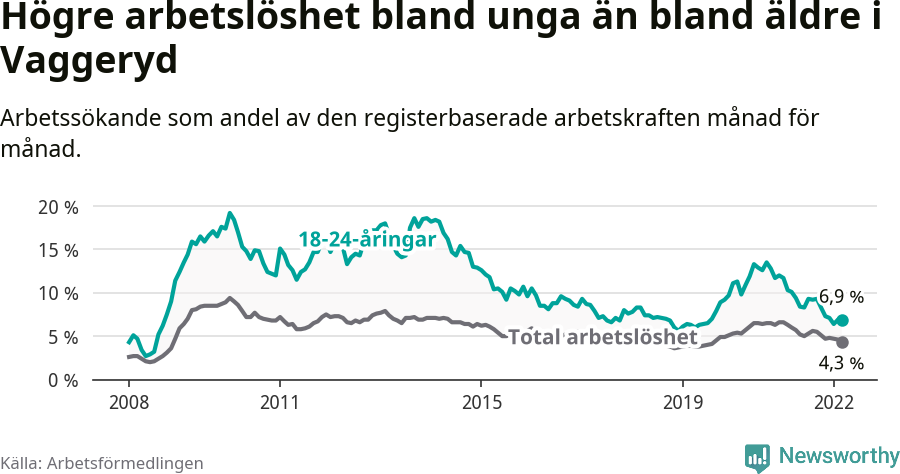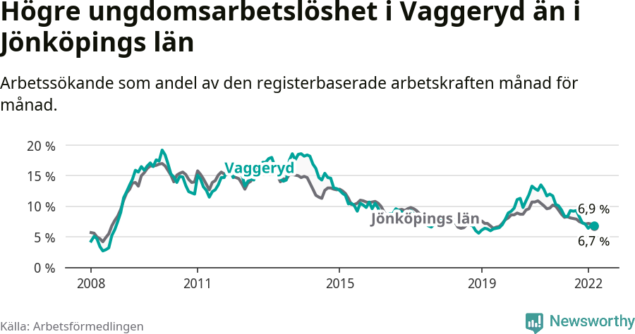 Medan Vaggeryd har lägre total arbetslöshet än Jönköpings län, ligger ungdomsarbetslösheten 0,2 procentenheter högre i Vaggeryd.