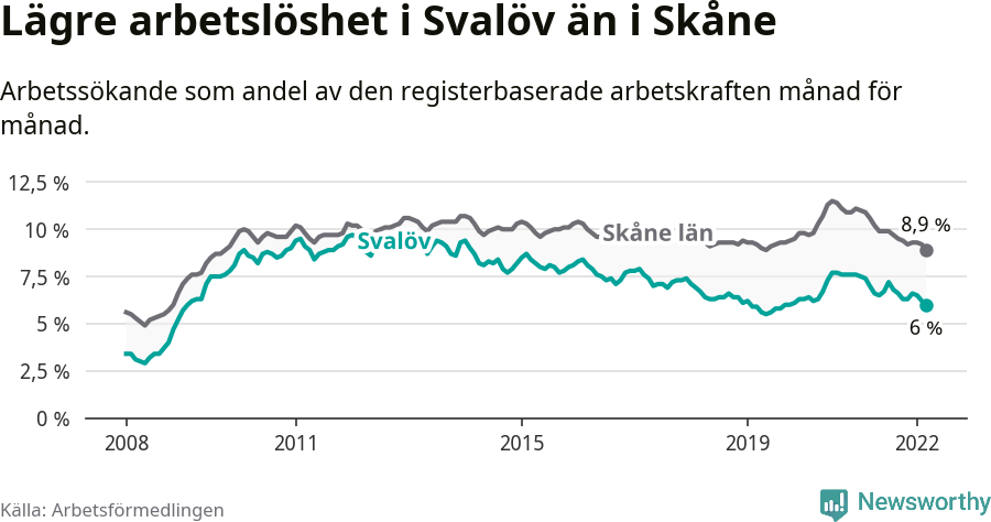 Det är elfte månaden i följd som arbetslösheten i Svalöv är lägre än den var under samma tidpunkt året innan. Den nuvarande arbetslöshetsnivån är därmed den lägsta sedan oktober 2019.