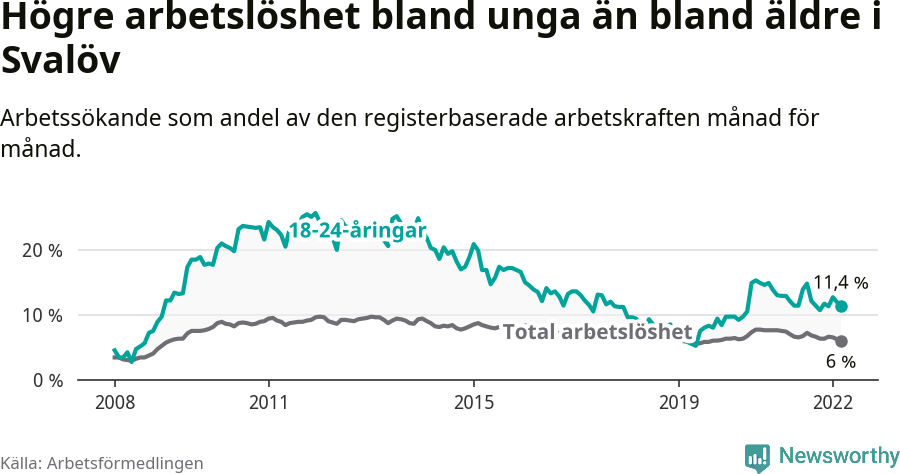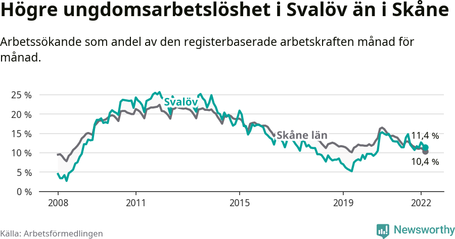 Medan Svalöv har lägre total arbetslöshet än Skåne, ligger ungdomsarbetslösheten 1,0 procentenheter högre i Svalöv.