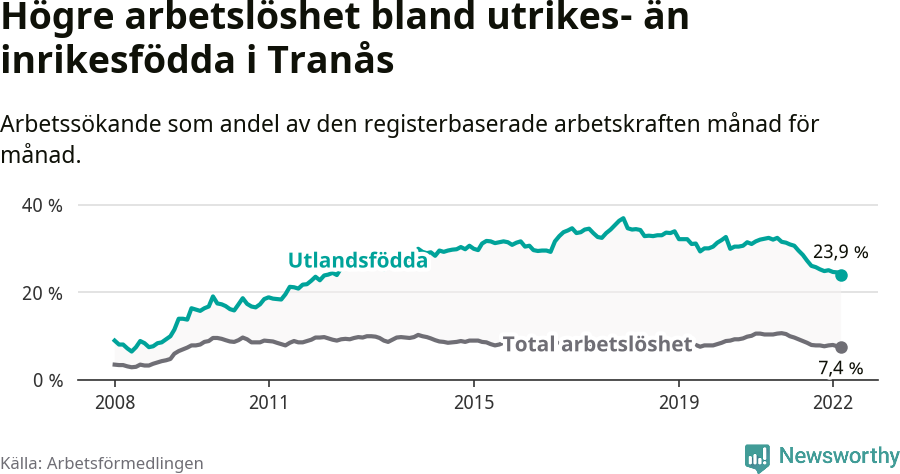 Arbetslösheten bland utlandsfödda var 23,9 procent i Tranås under mars månad, motsvarande 382 av 1 598 personer. Det är 7,0 procentenheter färre än vid samma tidpunkt i fjol (−169 om man räknar personer). Därmed är de utlandsföddas arbetslöshet lägre än vid samma tidpunkt i fjol för elfte månaden i följd. Sedan april 2021 har arbetslösheten bland utlandsfödda minskat från 30,6 till 23,9 procent. Den nuvarande arbetslöshetsnivån är den lägsta sedan maj 2012.