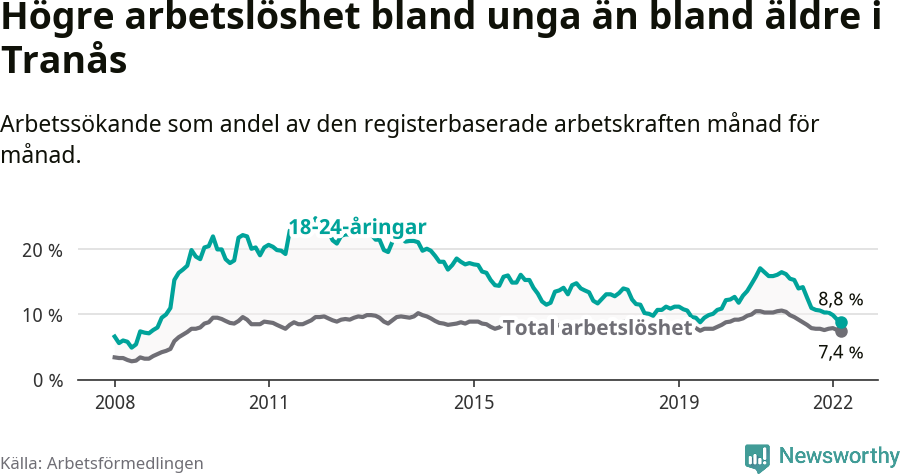 I och med den senaste månadens nedgång har de ungas arbetslöshet i Tranås sjunkit tio månader i följd (ner från 14,0 procent i maj 2021 till 8,8 procent nu). Den nuvarande arbetslöshetsnivån är den lägsta sedan juni 2019.