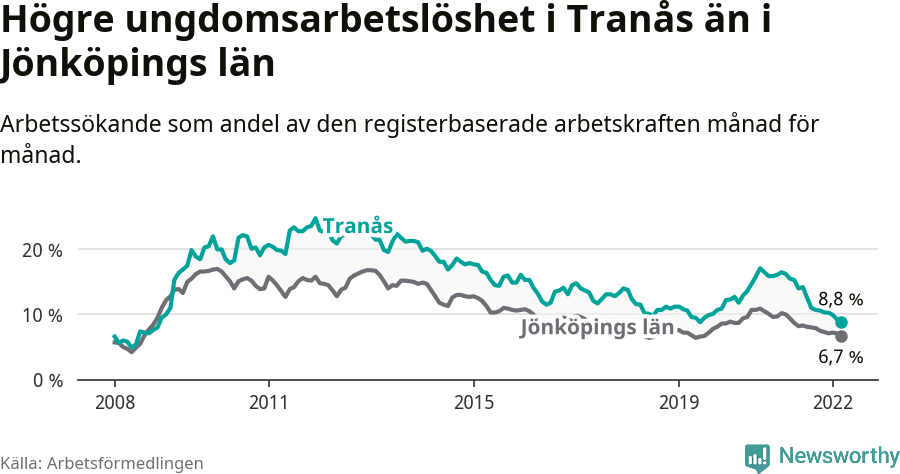 Precis som den totala arbetslösheten ligger ungdomsarbetslösheten i Tranås högre än i Jönköpings län som helhet. Skillnaden mellan kommunen och länet är 2,1 procentenheter.