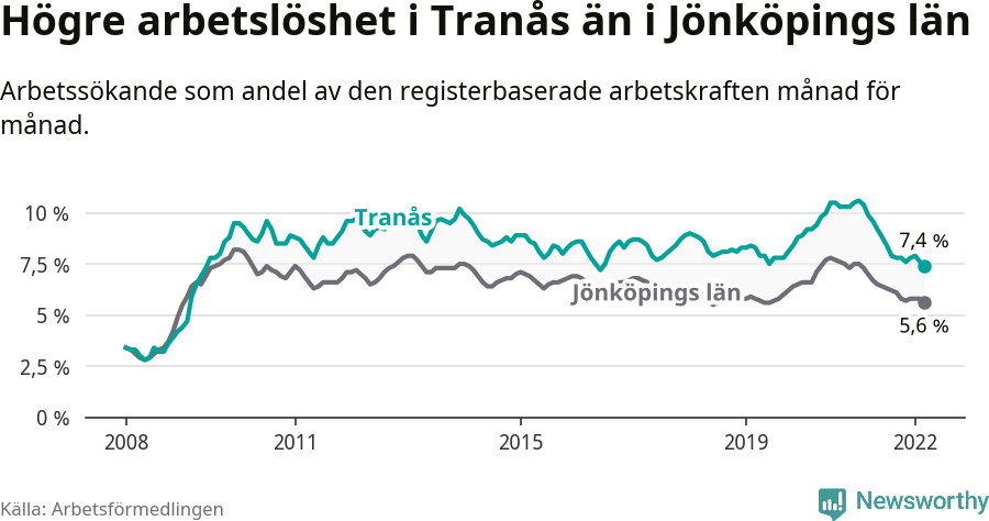 Det är elfte månaden i följd som arbetslösheten i Tranås är lägre än den var under samma tidpunkt året innan. Sedan april 2021 har arbetslösheten gått ner från 9,6 till 7,4 procent. Den nuvarande arbetslöshetsnivån är därmed den lägsta sedan juni 2016.