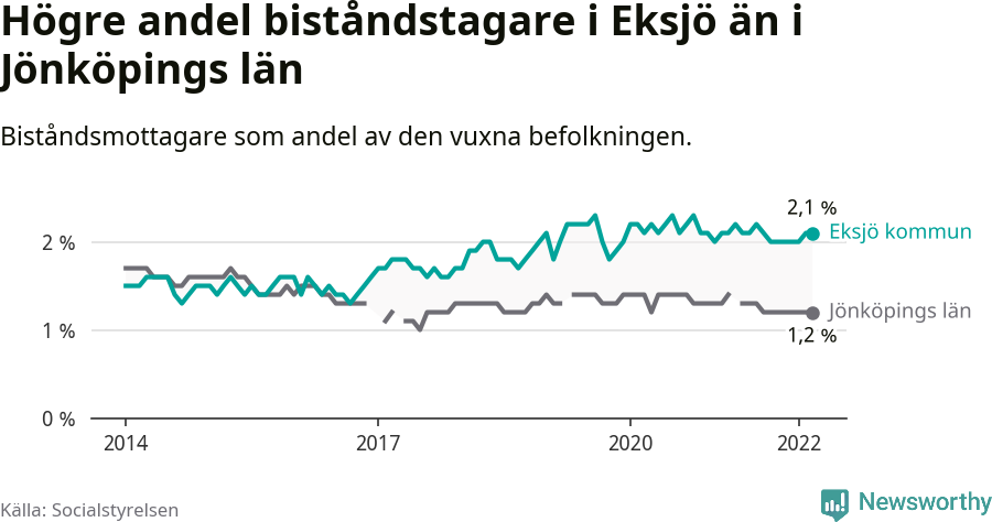Jämfört med andra kommuner i hela landet är andelen biståndstagare i Eksjö förhållandevis hög. Landets allra högsta nivåer finns i Filipstad, med 3,5 procent, och de lägsta i Pajala, Solna och Vellinge, med 0,2 procent.