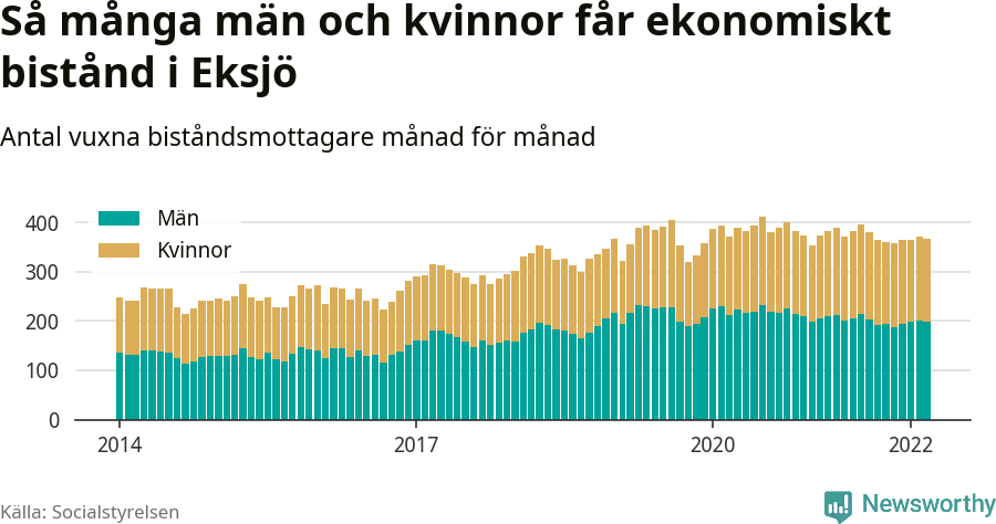 Av biståndstagarna i Eksjö kommun var förra månaden 169 kvinnor och 198 män.