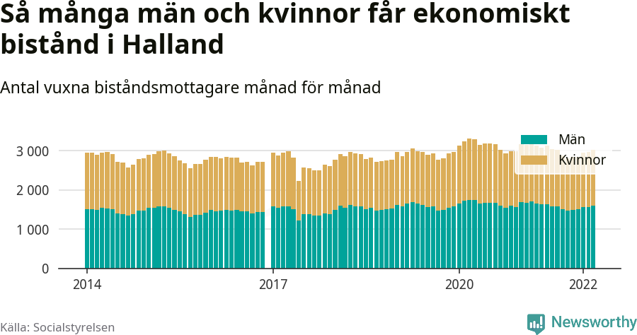 Av biståndstagarna i Hallands län var förra månaden 1 429 kvinnor och 1 592 män.