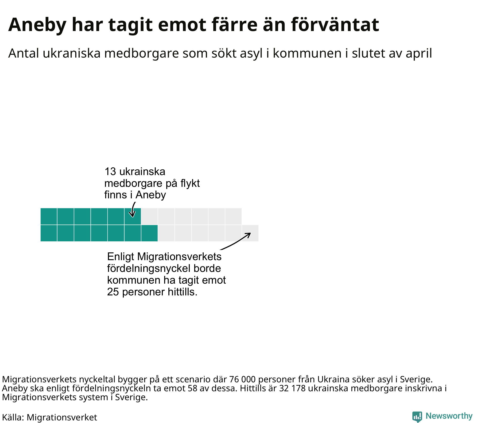 Enligt UNHCR har 5,9 miljoner människor hittills flytt från Ukraina sedan Rysslands anfall i slutet av februari. Ungefär 36 000 av dem har kommit till Sverige – och av dem som nu finns i det svenska systemet finns 13 personer i Aneby kommun. Det motsvarar två ukrainska flyktingar per 1 000 invånare, vilket placerar kommunen bland den tredjedel som hittills tagit emot minst ukrainska medborgare sett till befolkning. Flest i landet, sett till befolkning, har Högsby kommun tagit emot: 160 personer – eller 28 per 1 000 invånare.