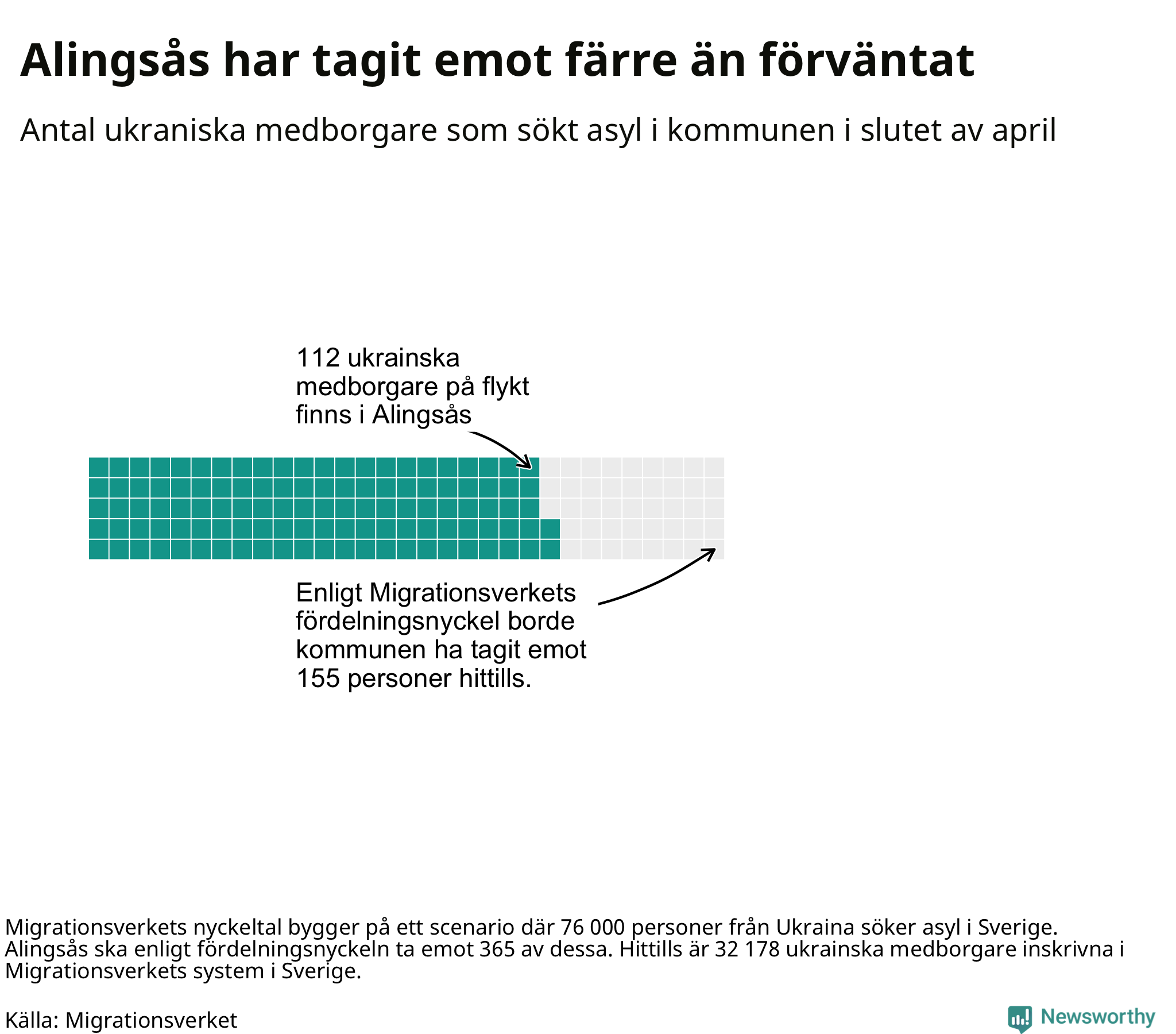 Enligt UNHCR har 5,9 miljoner människor hittills flytt från Ukraina sedan Rysslands anfall i slutet av februari. Ungefär 36 000 av dem har kommit till Sverige – och av dem som nu finns i det svenska systemet finns 112 personer i Alingsås kommun. Det motsvarar tre ukrainska flyktingar per 1 000 invånare, vilket placerar kommunen bland den tredjedel som hittills tagit emot minst ukrainska medborgare sett till befolkning. Flest i landet, sett till befolkning, har Högsby kommun tagit emot: 160 personer – eller 28 per 1 000 invånare.