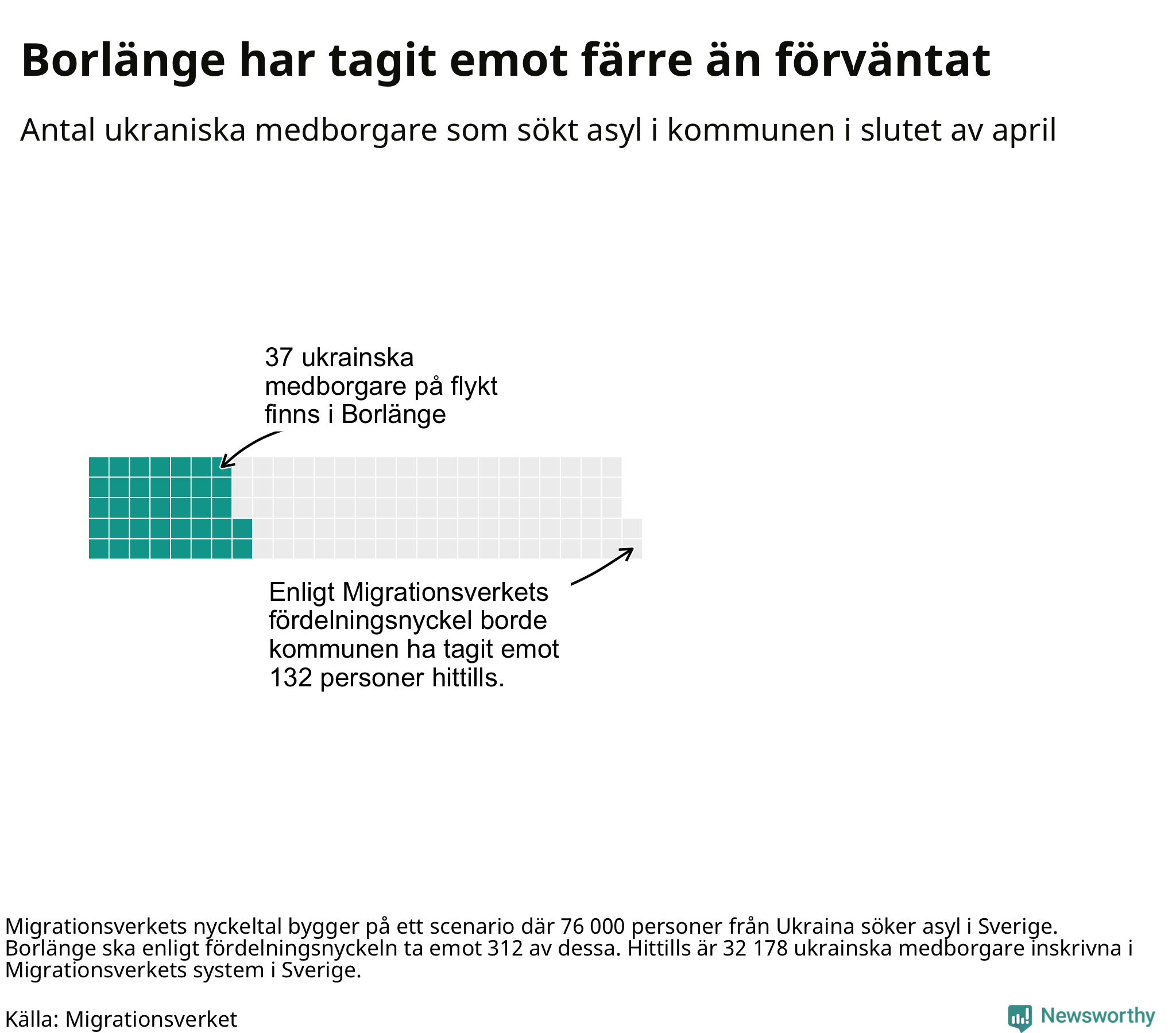 Fördelningsförslaget utgår från en tidigare prognos där 76 000 skyddssökande från Ukriana väntades under första halvåret. I den fördelningen ska Borlänge ta emot 312 av de 76 000. Vid samma fördelning borde Borlänge ha tagit emot 132 av de som anlänt hittills – kommunen har alltså tagit emot 95 färre ukrainska medborgare än förväntat.