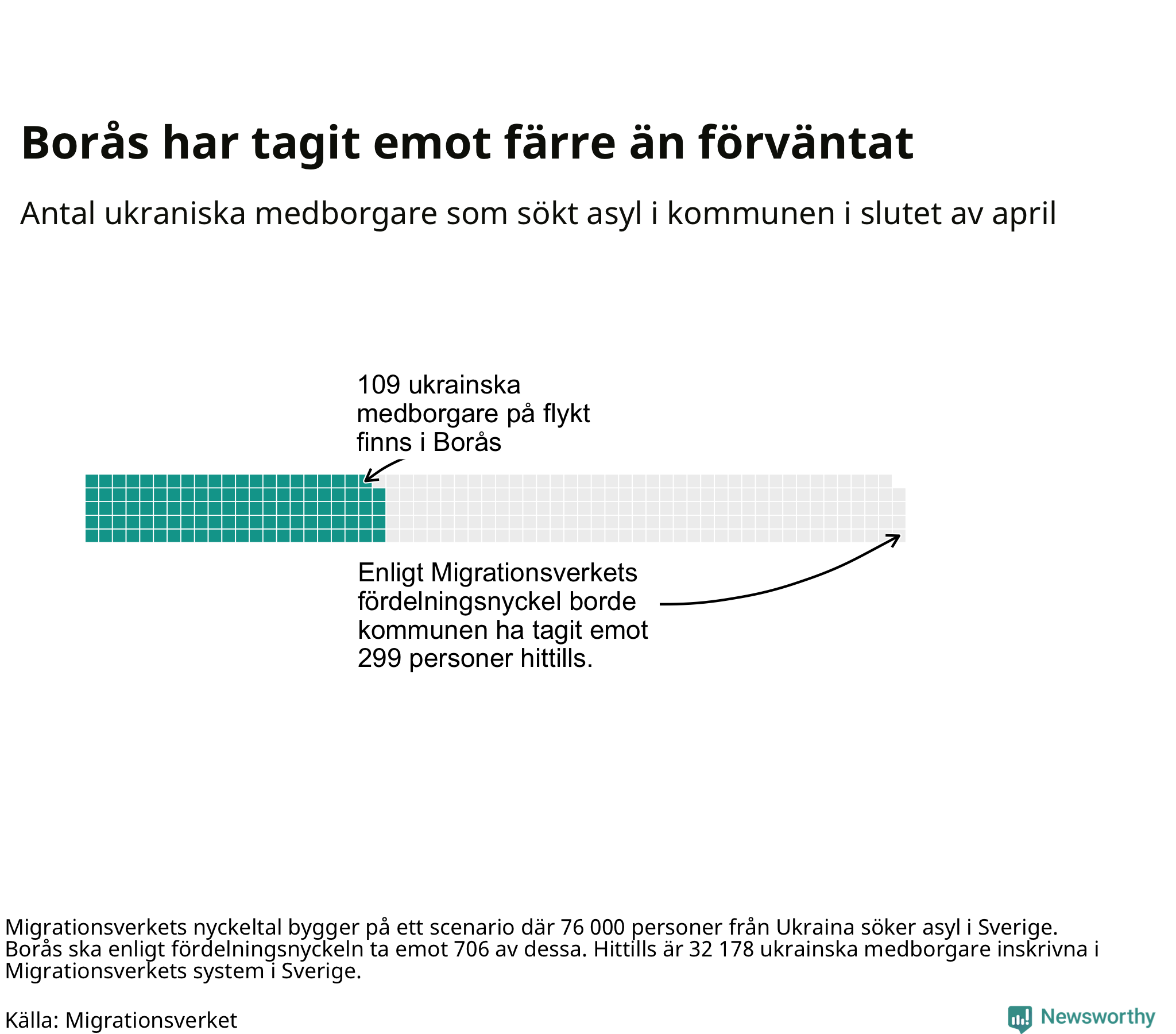 Fördelningsförslaget utgår från en tidigare prognos där 76 000 skyddssökande från Ukriana väntades under första halvåret. I den fördelningen ska Borås ta emot 706 av de 76 000. Vid samma fördelning borde Borås ha tagit emot 299 av de som anlänt hittills – kommunen har alltså tagit emot 190 färre ukrainska medborgare än förväntat.