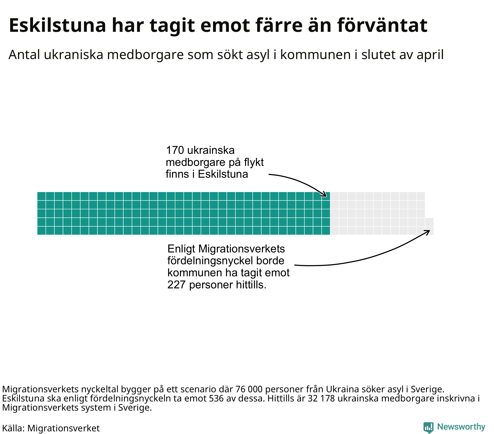 Enligt UNHCR har 5,9 miljoner människor hittills flytt från Ukraina sedan Rysslands anfall i slutet av februari. Ungefär 36 000 av dem har kommit till Sverige – och av dem som nu finns i det svenska systemet finns 170 personer i Eskilstuna kommun. Det motsvarar två ukrainska flyktingar per 1 000 invånare, vilket är en ganska genomsnittlig andel. Flest i landet, sett till befolkning, har Högsby kommun tagit emot: 160 personer – eller 28 per 1 000 invånare.