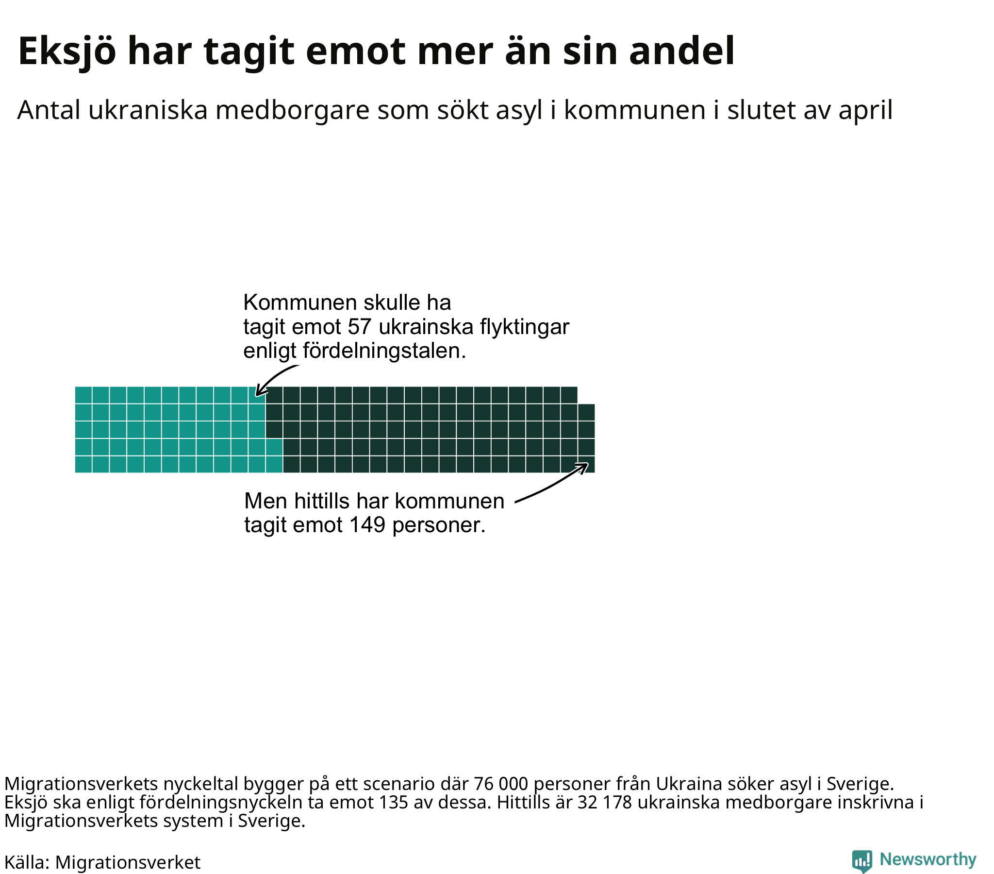Fördelningsförslaget utgår från en tidigare prognos där 76 000 skyddssökande från Ukriana väntades under första halvåret. I den fördelningen ska Eksjö ta emot 135 av de 76 000. Vid samma fördelning borde Eksjö ha tagit emot 57 av de som anlänt hittills – kommunen har alltså tagit emot 92 fler ukrainska medborgare än förväntat.