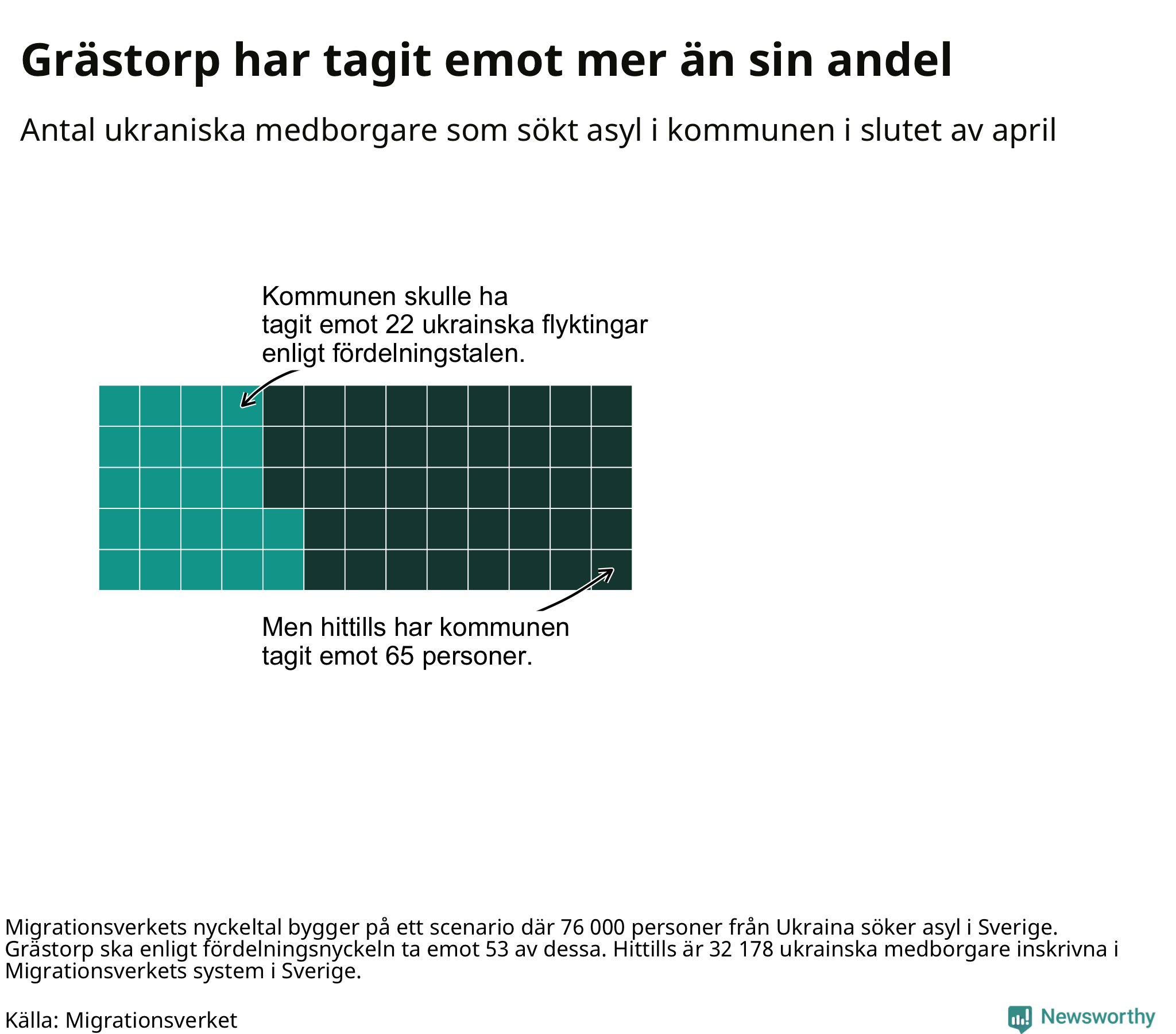Enligt UNHCR har 5,9 miljoner människor hittills flytt från Ukraina sedan Rysslands anfall i slutet av februari. Ungefär 36 000 av dem har kommit till Sverige – och av dem som nu finns i det svenska systemet finns 65 personer i Grästorps kommun. Det motsvarar elva ukrainska flyktingar per 1 000 invånare, vilket placerar kommunen bland den tredjedel som hittills tagit emot flest. Flest i landet, sett till befolkning, har Högsby kommun tagit emot: 160 personer – eller 28 per 1 000 invånare.