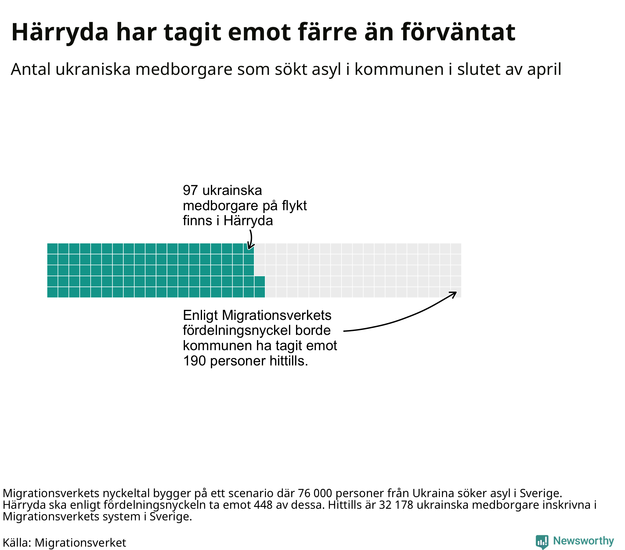 Enligt UNHCR har 5,9 miljoner människor hittills flytt från Ukraina sedan Rysslands anfall i slutet av februari. Ungefär 36 000 av dem har kommit till Sverige – och av dem som nu finns i det svenska systemet finns 97 personer i Härryda kommun. Det motsvarar två ukrainska flyktingar per 1 000 invånare, vilket placerar kommunen bland den tredjedel som hittills tagit emot minst ukrainska medborgare sett till befolkning. Flest i landet, sett till befolkning, har Högsby kommun tagit emot: 160 personer – eller 28 per 1 000 invånare.