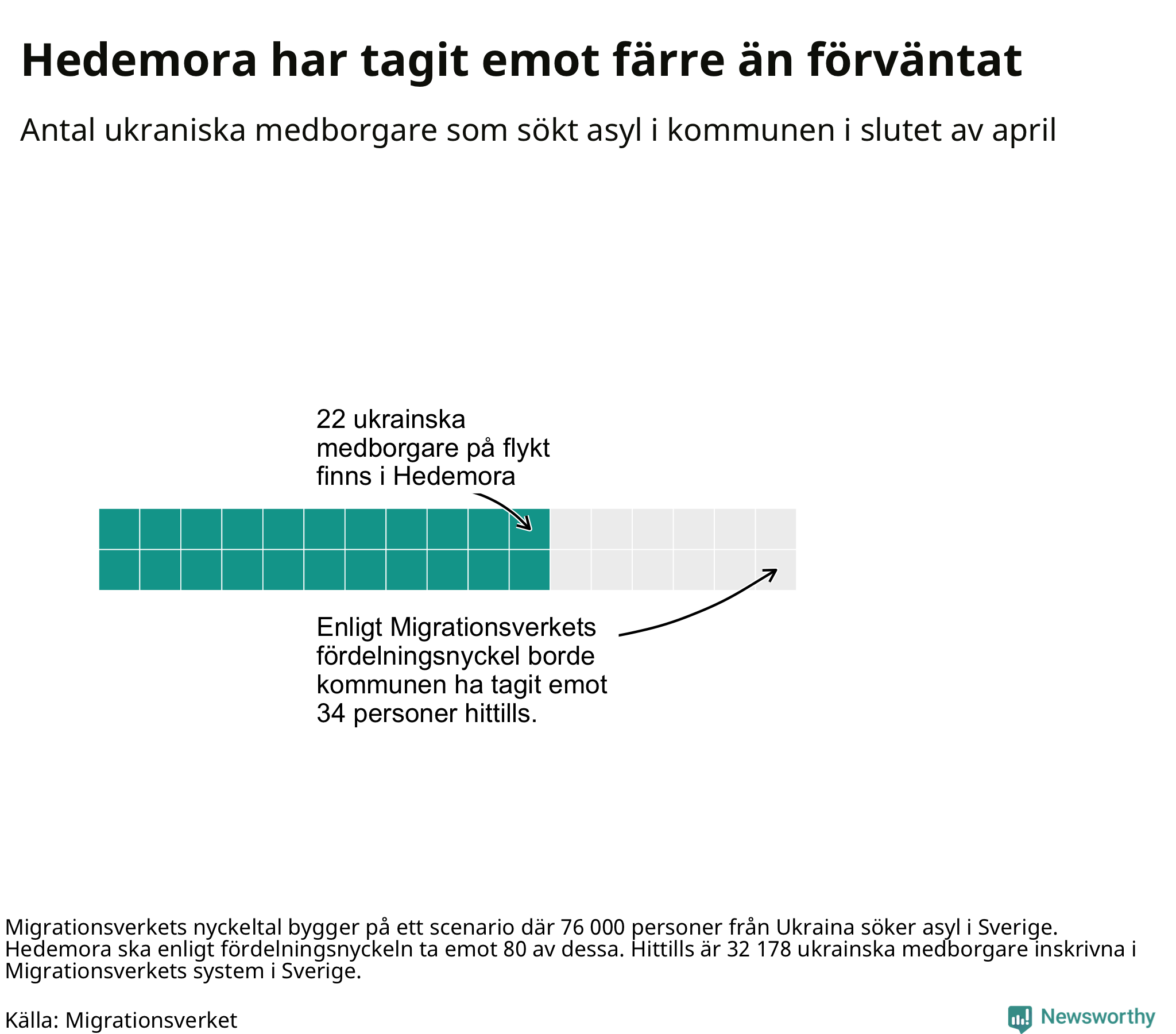 Fördelningsförslaget utgår från en tidigare prognos där 76 000 skyddssökande från Ukriana väntades under första halvåret. I den fördelningen ska Hedemora ta emot 80 av de 76 000. Vid samma fördelning borde Hedemora ha tagit emot 34 av de som anlänt hittills – kommunen har alltså tagit emot tolv färre ukrainska medborgare än förväntat.