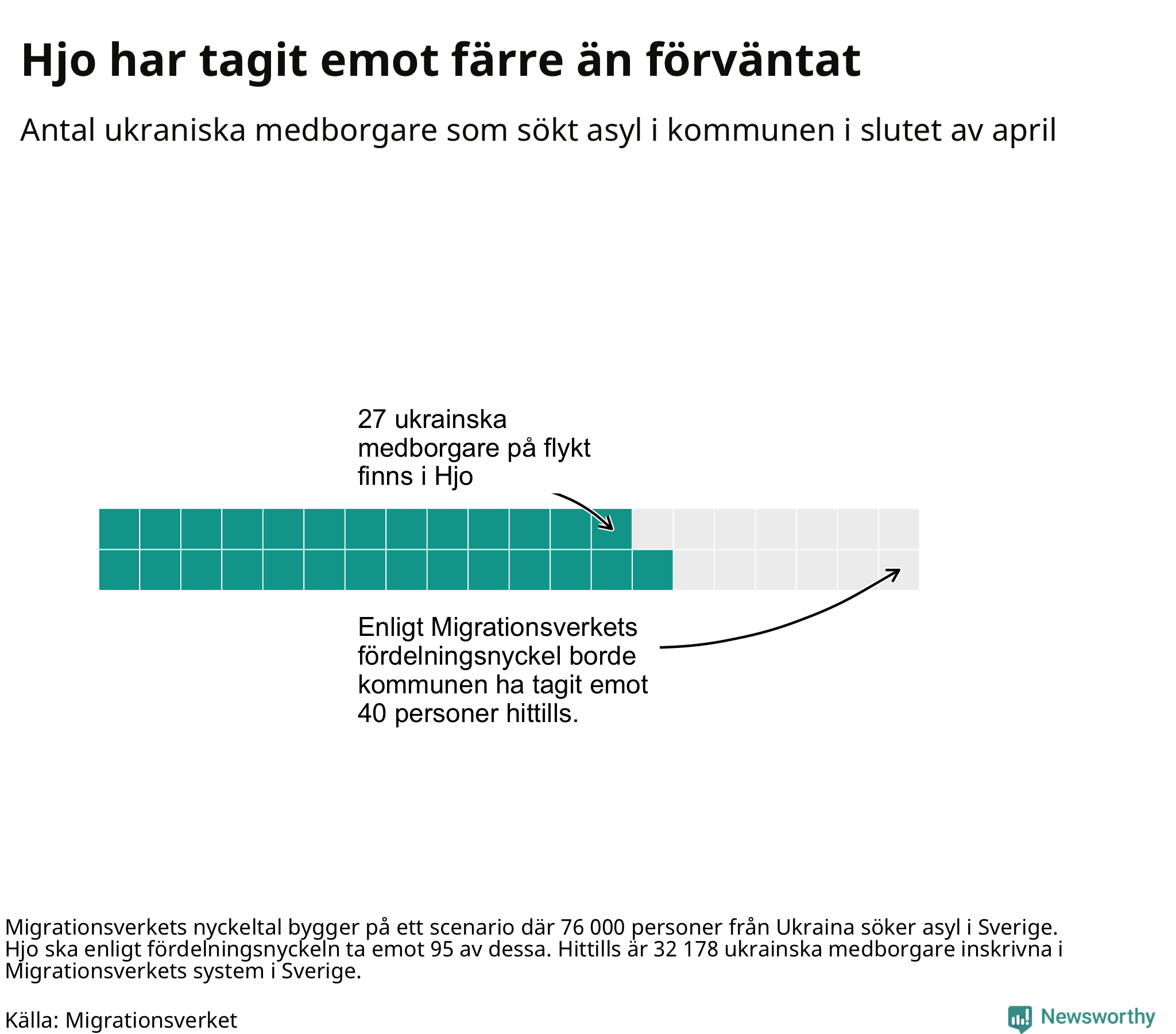 Fördelningsförslaget utgår från en tidigare prognos där 76 000 skyddssökande från Ukriana väntades under första halvåret. I den fördelningen ska Hjo ta emot 95 av de 76 000. Vid samma fördelning borde Hjo ha tagit emot 40 av de som anlänt hittills – kommunen har alltså tagit emot 13 färre ukrainska medborgare än förväntat.