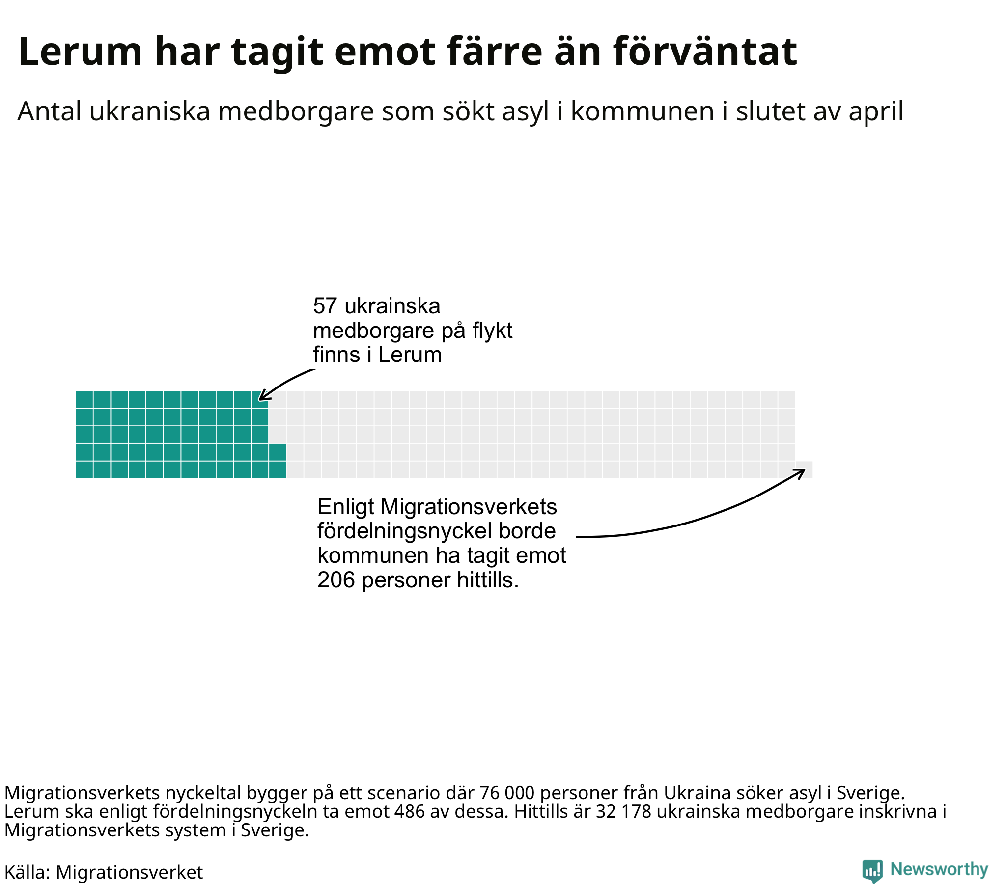 Fördelningsförslaget utgår från en tidigare prognos där 76 000 skyddssökande från Ukriana väntades under första halvåret. I den fördelningen ska Lerum ta emot 486 av de 76 000. Vid samma fördelning borde Lerum ha tagit emot 206 av de som anlänt hittills – kommunen har alltså tagit emot 149 färre ukrainska medborgare än förväntat.
