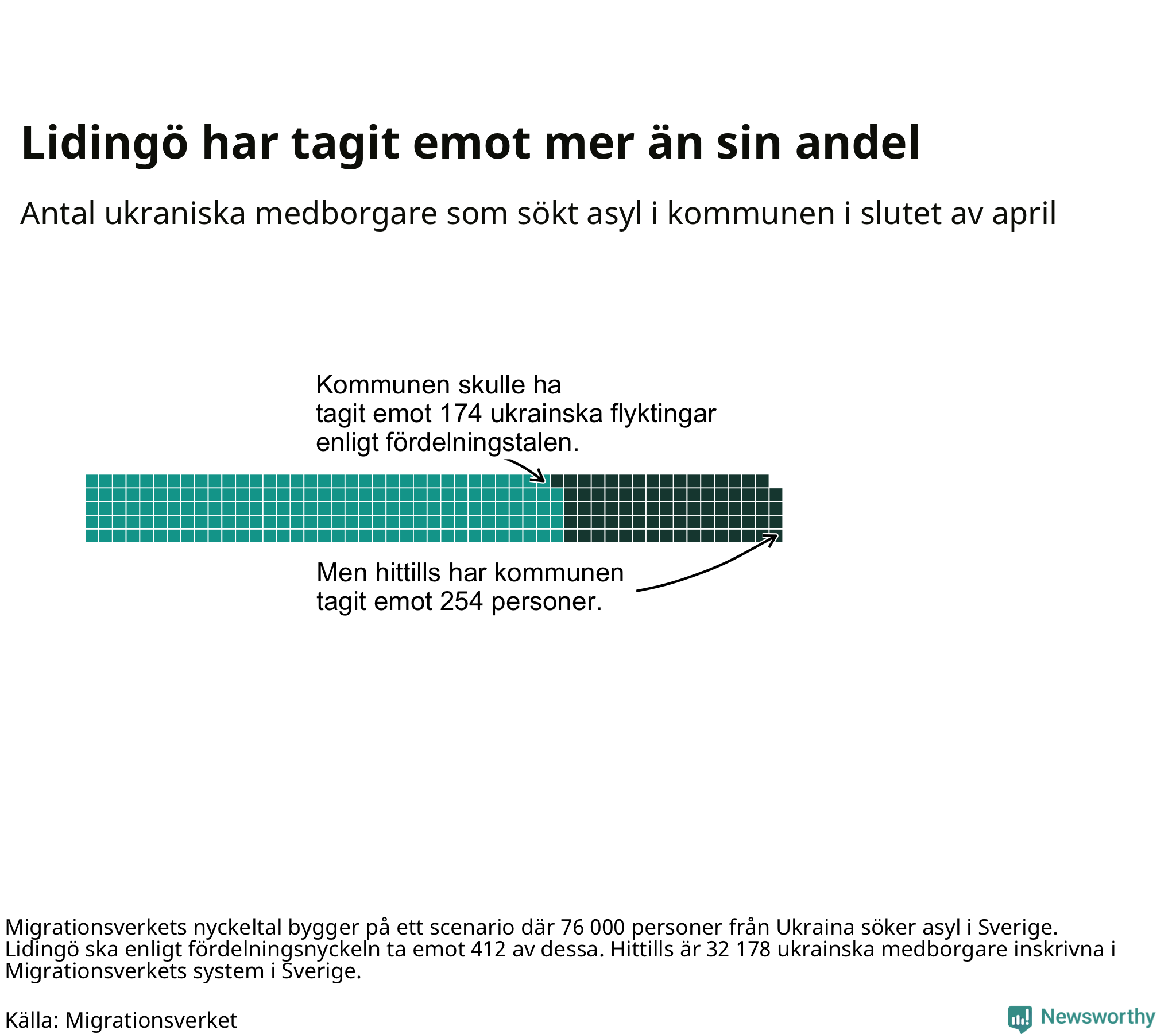 Fördelningsförslaget utgår från en tidigare prognos där 76 000 skyddssökande från Ukriana väntades under första halvåret. I den fördelningen ska Lidingö ta emot 412 av de 76 000. Vid samma fördelning borde Lidingö ha tagit emot 174 av de som anlänt hittills – kommunen har alltså tagit emot 80 fler ukrainska medborgare än förväntat.