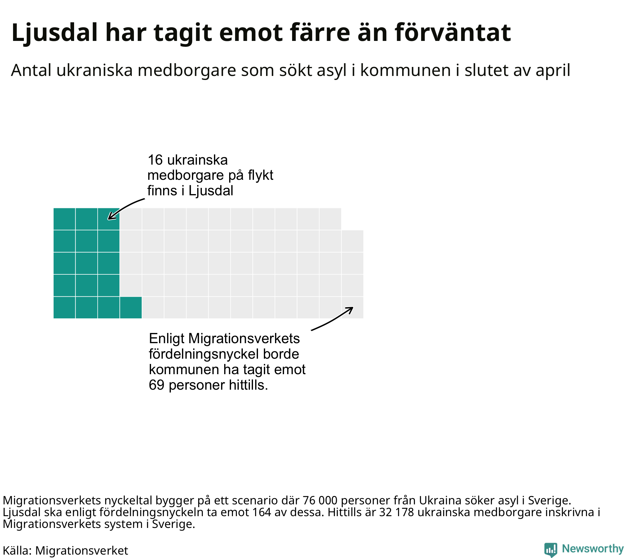 Fördelningsförslaget utgår från en tidigare prognos där 76 000 skyddssökande från Ukriana väntades under första halvåret. I den fördelningen ska Ljusdal ta emot 164 av de 76 000. Vid samma fördelning borde Ljusdal ha tagit emot 69 av de som anlänt hittills – kommunen har alltså tagit emot 53 färre ukrainska medborgare än förväntat.