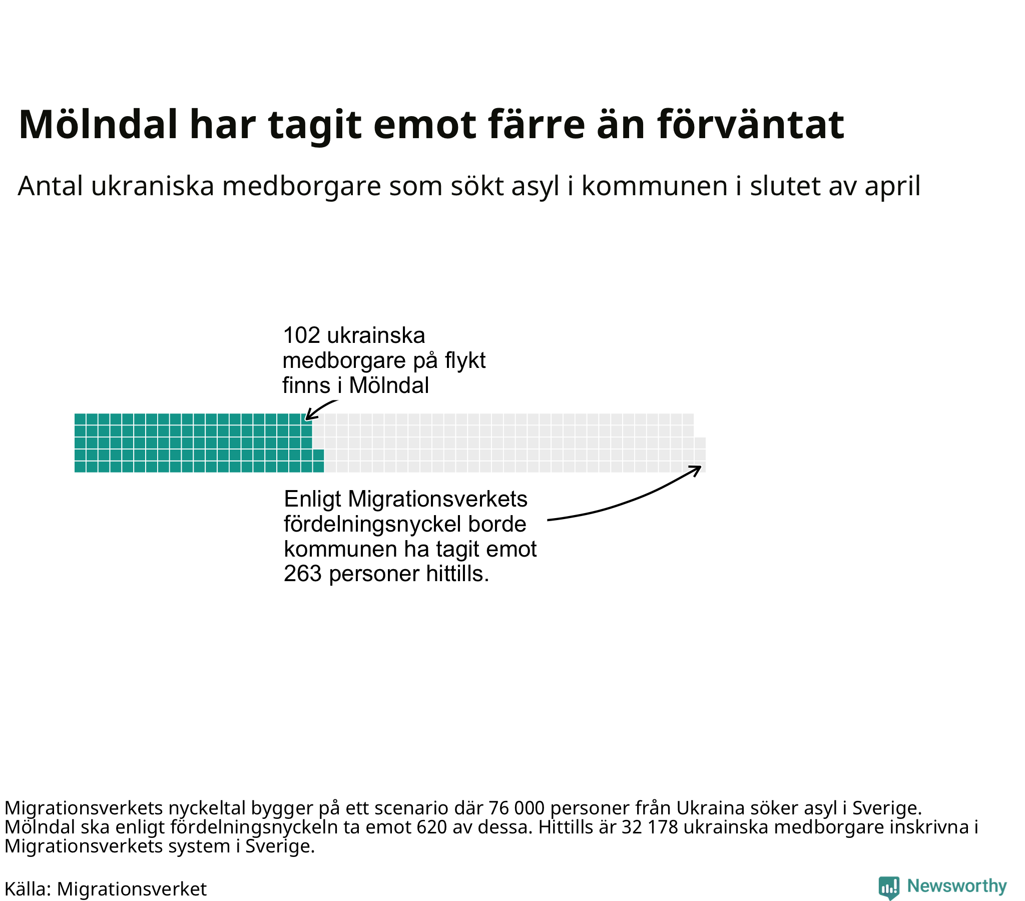 Fördelningsförslaget utgår från en tidigare prognos där 76 000 skyddssökande från Ukriana väntades under första halvåret. I den fördelningen ska Mölndal ta emot 620 av de 76 000. Vid samma fördelning borde Mölndal ha tagit emot 263 av de som anlänt hittills – kommunen har alltså tagit emot 161 färre ukrainska medborgare än förväntat.