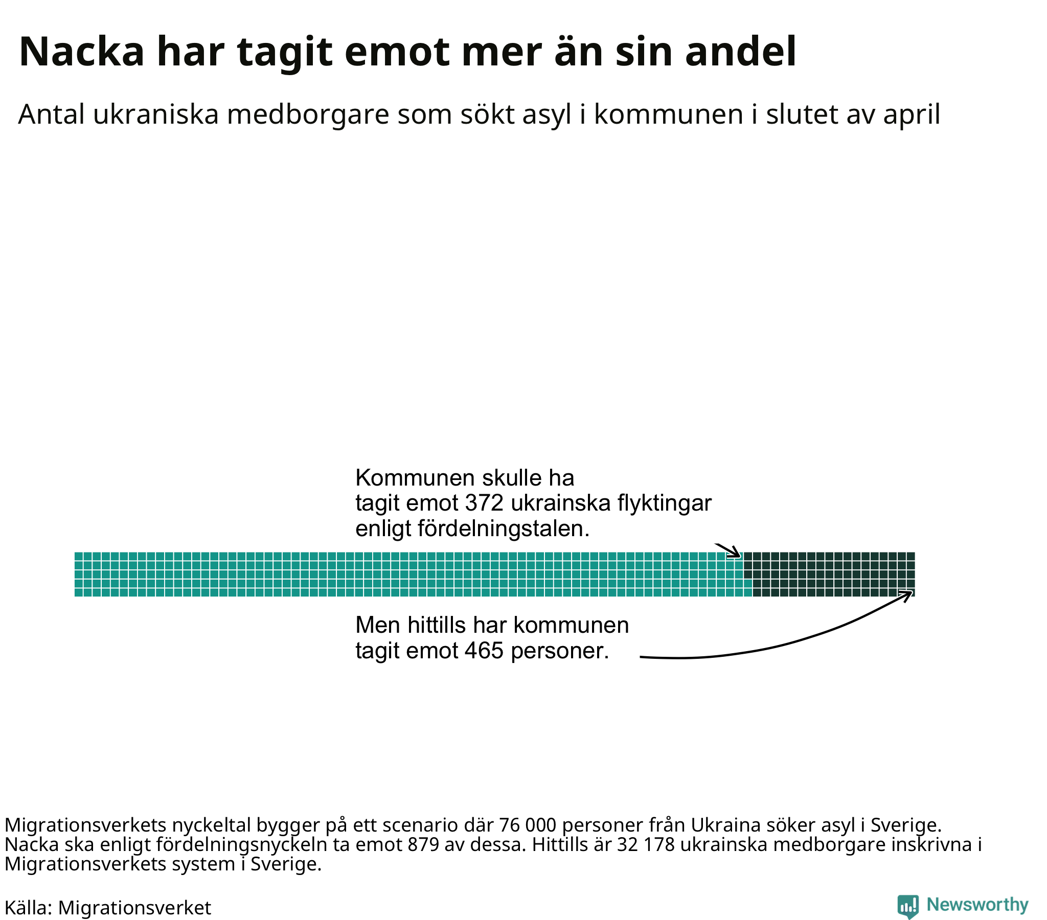 Enligt UNHCR har 5,9 miljoner människor hittills flytt från Ukraina sedan Rysslands anfall i slutet av februari. Ungefär 36 000 av dem har kommit till Sverige – och av dem som nu finns i det svenska systemet finns 465 personer i Nacka kommun. Det motsvarar fyra ukrainska flyktingar per 1 000 invånare, vilket placerar kommunen bland den tredjedel som hittills tagit emot flest. Flest i landet, sett till befolkning, har Högsby kommun tagit emot: 160 personer – eller 28 per 1 000 invånare.