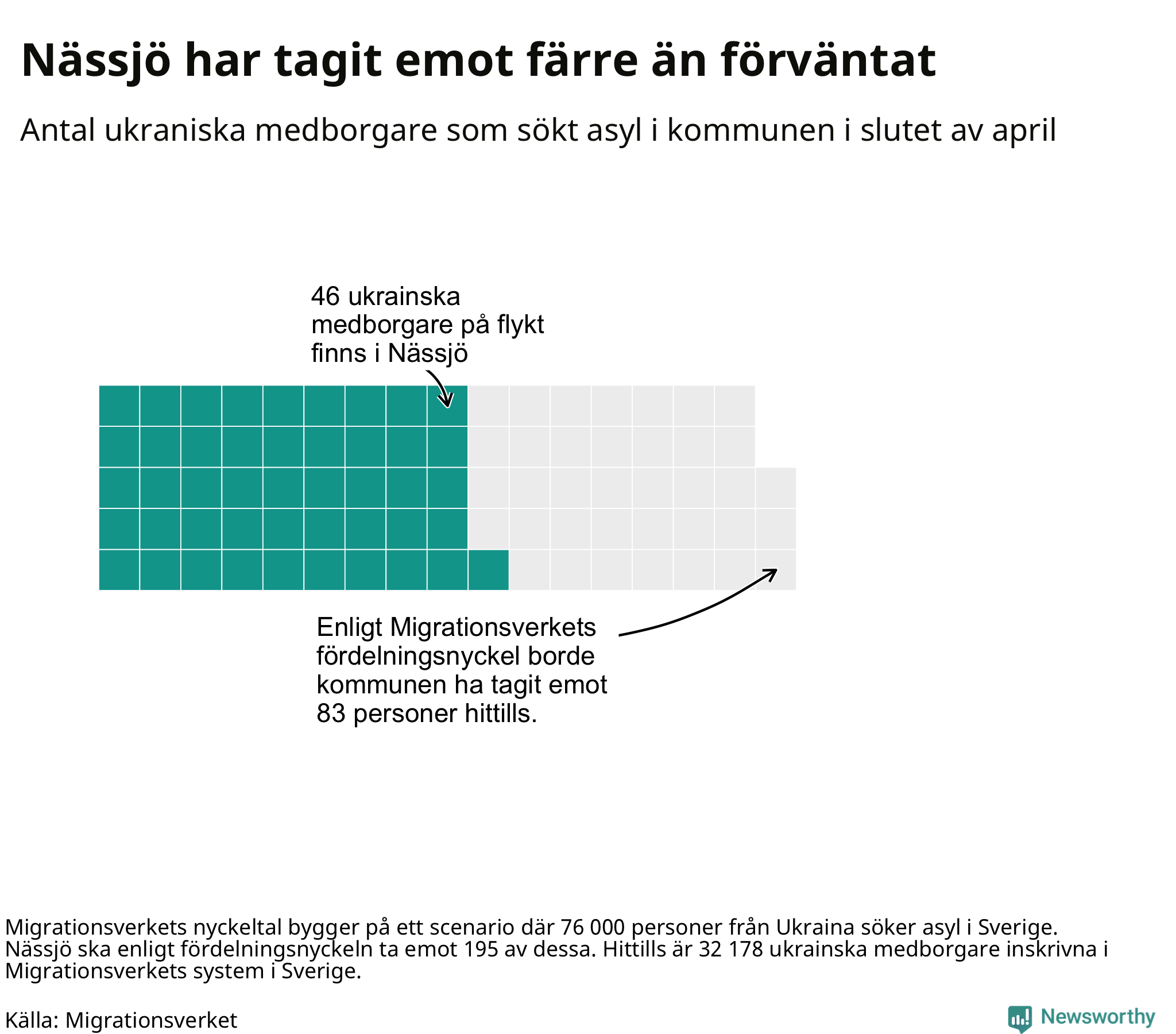 Fördelningsförslaget utgår från en tidigare prognos där 76 000 skyddssökande från Ukriana väntades under första halvåret. I den fördelningen ska Nässjö ta emot 195 av de 76 000. Vid samma fördelning borde Nässjö ha tagit emot 83 av de som anlänt hittills – kommunen har alltså tagit emot 37 färre ukrainska medborgare än förväntat.