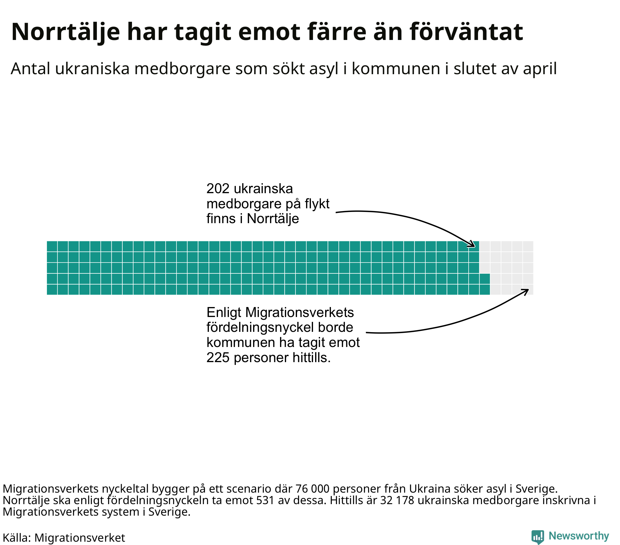 Fördelningsförslaget utgår från en tidigare prognos där 76 000 skyddssökande från Ukriana väntades under första halvåret. I den fördelningen ska Norrtälje ta emot 531 av de 76 000. Vid samma fördelning borde Norrtälje ha tagit emot 225 av de som anlänt hittills – kommunen har alltså tagit emot 23 färre ukrainska medborgare än förväntat.