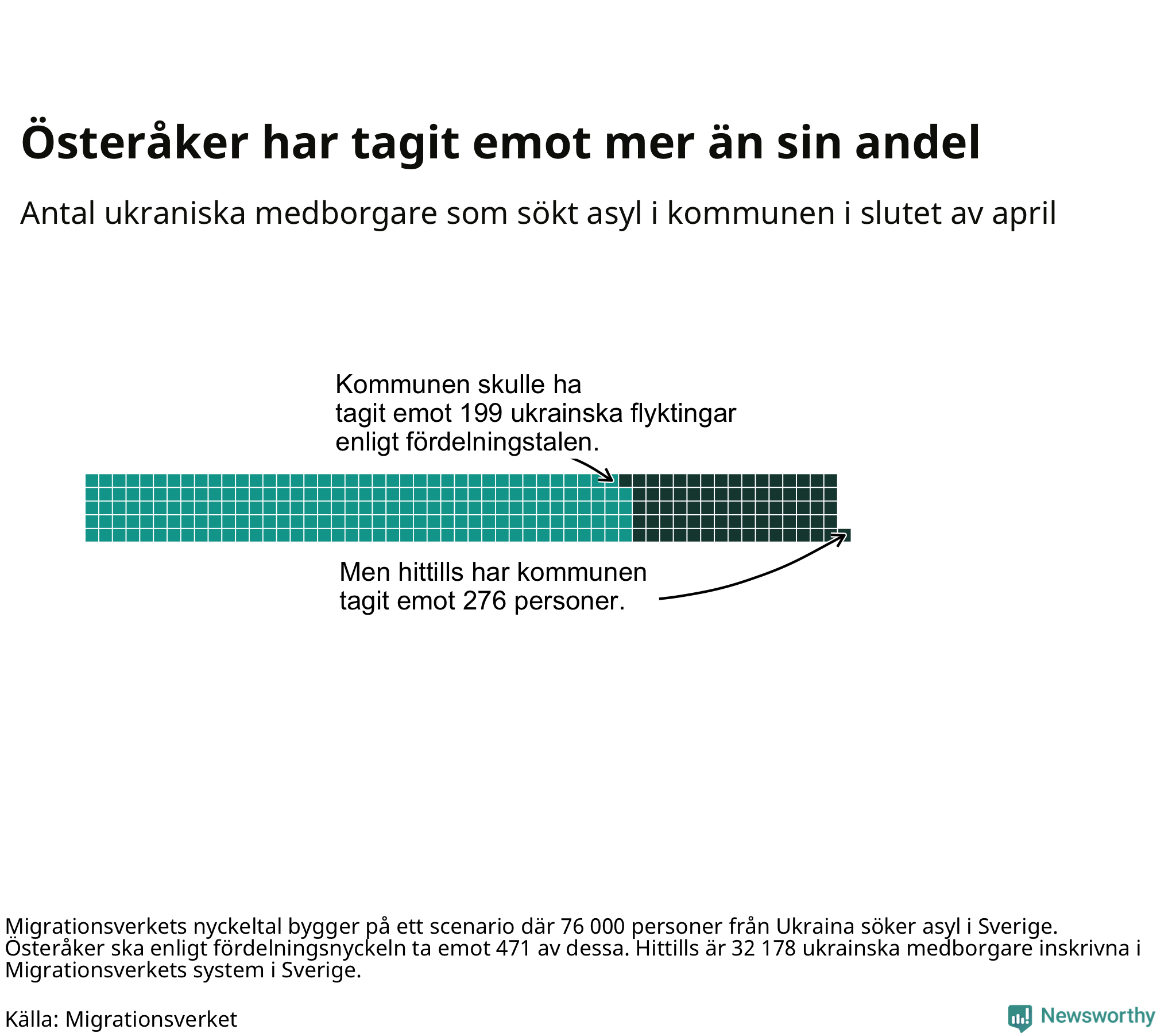 Fördelningsförslaget utgår från en tidigare prognos där 76 000 skyddssökande från Ukriana väntades under första halvåret. I den fördelningen ska Österåker ta emot 471 av de 76 000. Vid samma fördelning borde Österåker ha tagit emot 199 av de som anlänt hittills – kommunen har alltså tagit emot 77 fler ukrainska medborgare än förväntat.