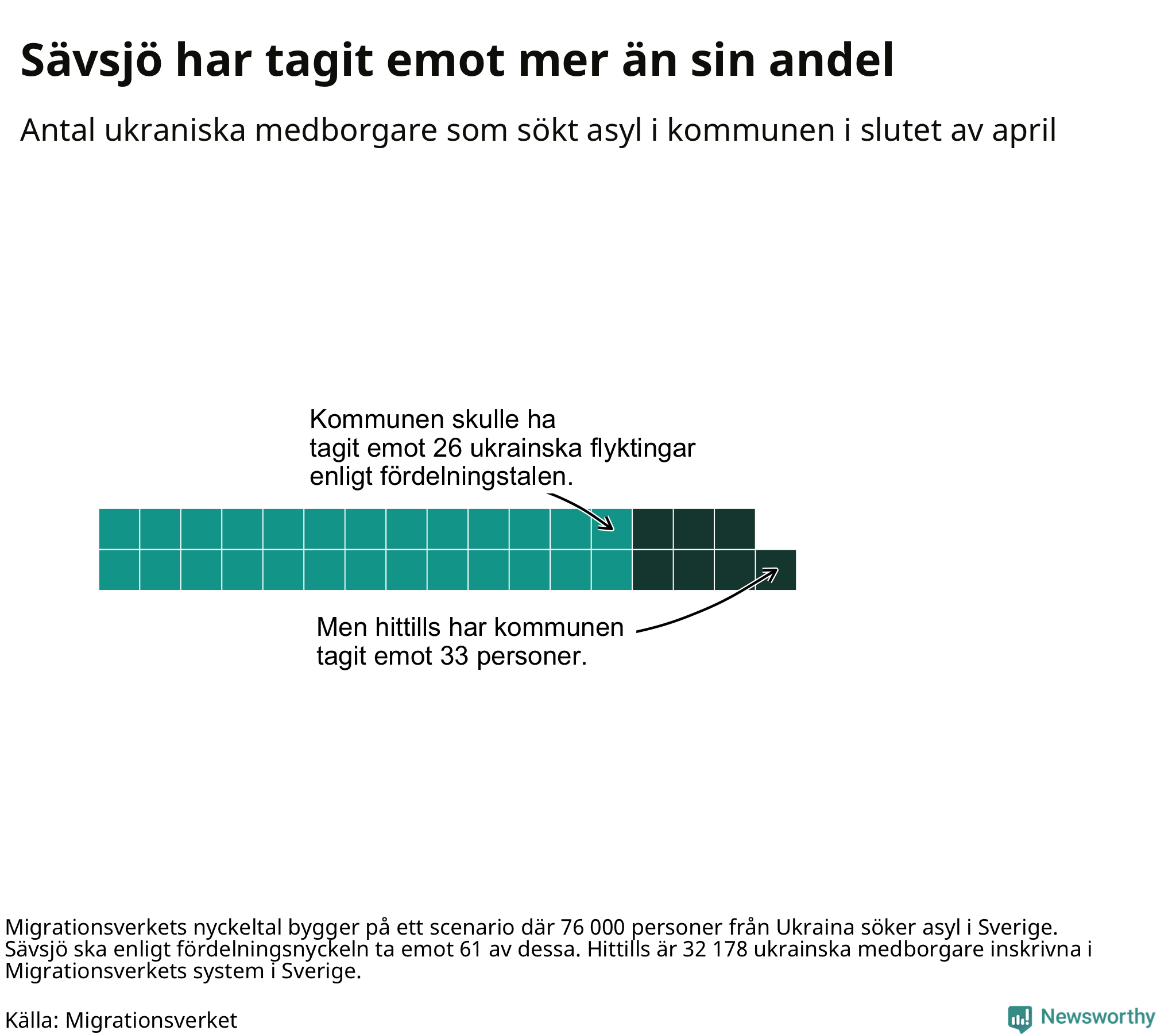 Fördelningsförslaget utgår från en tidigare prognos där 76 000 skyddssökande från Ukriana väntades under första halvåret. I den fördelningen ska Sävsjö ta emot 61 av de 76 000. Vid samma fördelning borde Sävsjö ha tagit emot 26 av de som anlänt hittills – kommunen har alltså tagit emot sju fler ukrainska medborgare än förväntat.